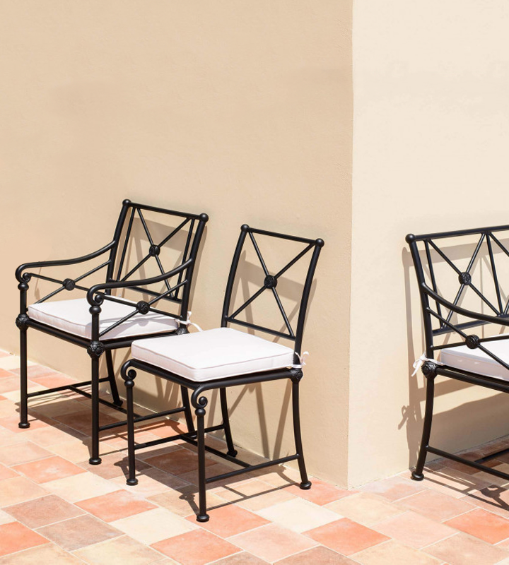 The 1800s collection by Tectona reflects the brand’s commitment to traditional craftsmanship and architectural elegance. The collection honours the French Directory period of design and reinvents wrought-iron’s appeal with a lighter weight, more durable aluminium design finished in a striking matte black or signature blue-grey finish.