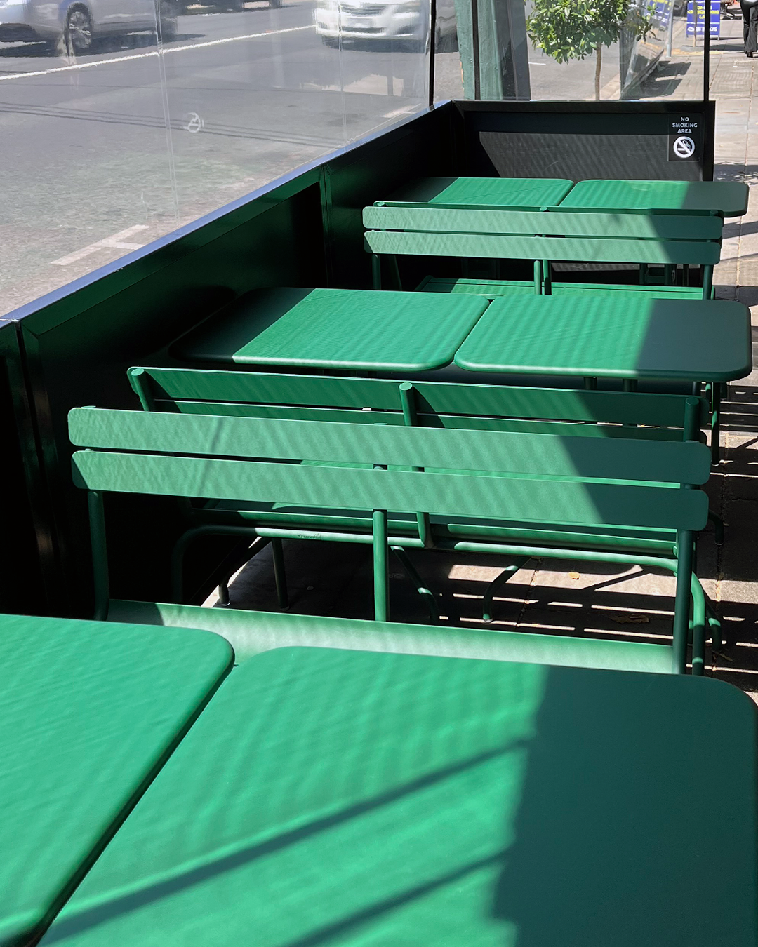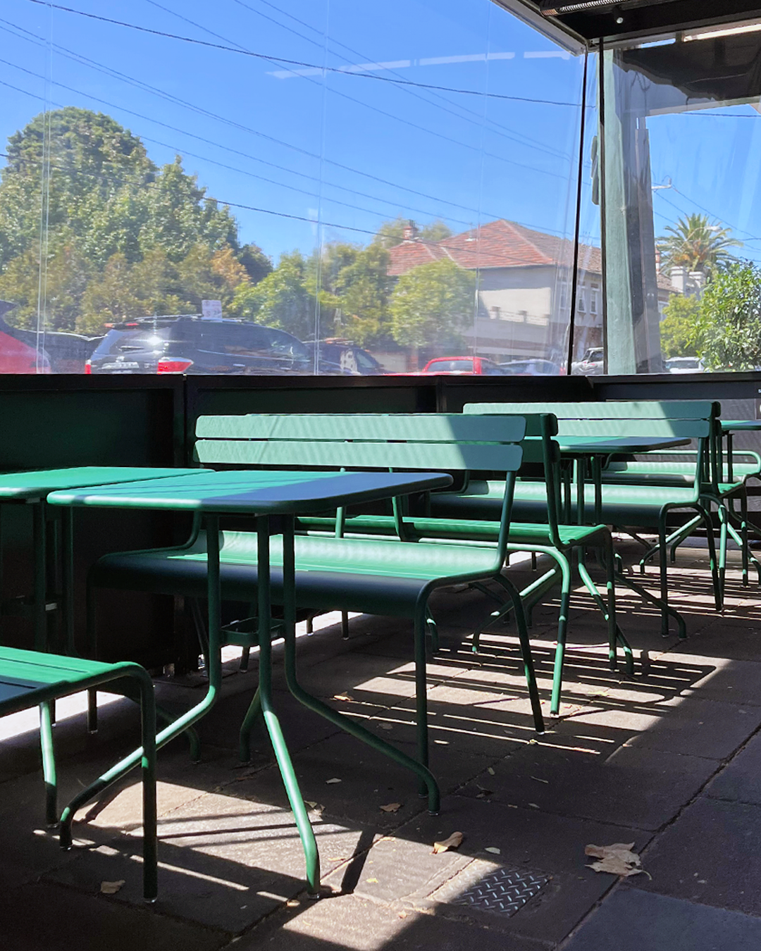 Nestled in the heart of Glen Iris, Grazia Restaurant’s outdoor space is a testament to effortless elegance. Featuring stunning Luxembourg benches and Petale tables in a rich Cedar Green finish, the setting perfectly complements the restaurant’s refined interior design. The rich green tones add a fresh, inviting energy, seamlessly connecting the outdoor and indoor spaces. Designed for both style and durability, the setting invites guests to relax and enjoy their surroundings in absolute comfort.